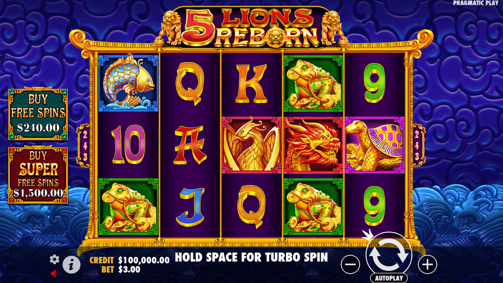 5 Lions Reborn presenta una grafica ricca e dettagliata incentrata su uno sfondo di un tempio di giada, dove i simboli della fenice, della tartaruga e delle koi brillano in una filigrana dorata decorata. I sottili bagliori di particelle e le esplosioni di luce aggiungono una sensazione di raffinatezza e dinamicità senza sopraffare l'estetica tradizionale cinese.